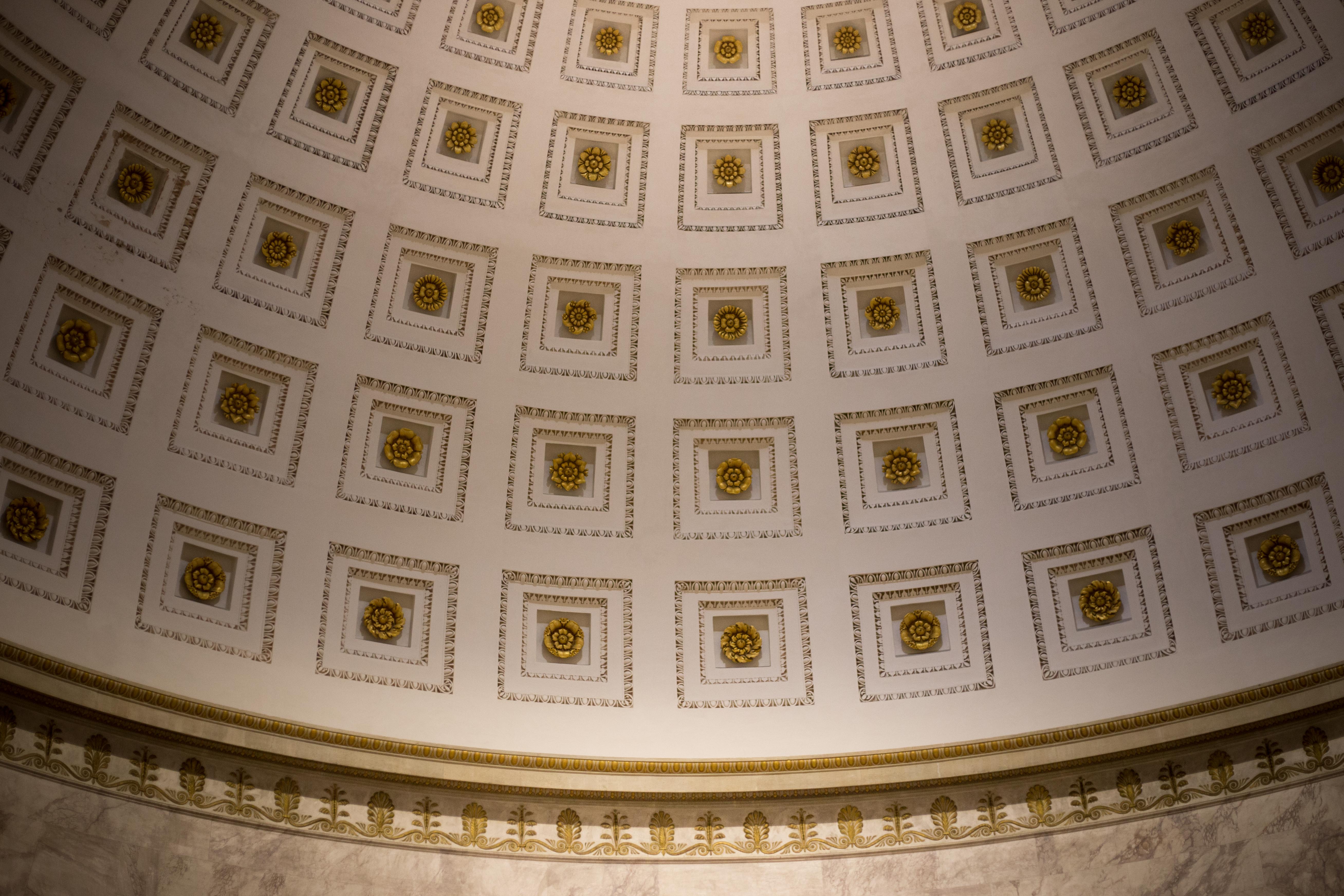 La volta della cupola semisferica poggia su una graziosa cornice con fregi dorati ed è decorata da lacunari, in sette file orizzontali concentriche. Ogni cassettone, al centro, ha un rosone di legno dorato, opera di intaglio di quattordici diverse forme. “Dal centro della cupola poi discende la luce, che si espande dall’alto con temperamento assai vago.